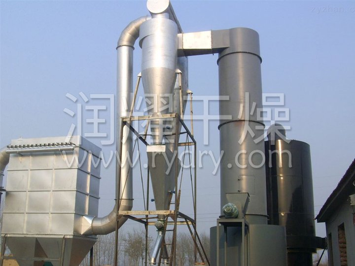 熱空氣由入口管以適宜的噴動(dòng)速度從干燥機(jī)底部進(jìn)入攪拌粉碎干燥室,對(duì)物料產(chǎn)生強(qiáng)烈的剪切、吹浮、旋轉(zhuǎn)作用,于是物料受到離心、剪切、碰撞、摩擦而被微粒化,強(qiáng)化了傳質(zhì)傳熱。在干燥機(jī)底部,較大較濕的顆粒團(tuán)在攪拌器的作用下被機(jī)械破碎,濕含量較低、顆粒度較小的顆粒被旋轉(zhuǎn)氣流夾帶上升,在上升過程中進(jìn)一步干燥。由于氣固兩相作旋轉(zhuǎn)流動(dòng)。固相慣性大于氣相,固氣兩相間的相對(duì)速度較大,強(qiáng)化兩相間的傳質(zhì)傳熱.所以該機(jī)生產(chǎn)強(qiáng)度高。